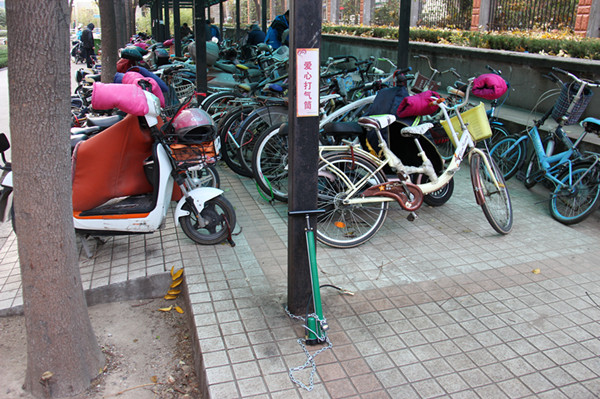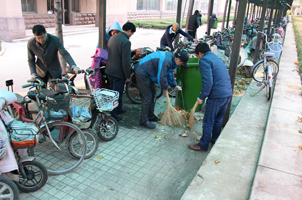 为保证本次志愿活动取得实效,真正扭转北车棚车辆管理混乱的现象,后勤物业党支部将志愿者分为两个小组,一组负责清理乱停乱放车辆工作,另一组负责场地垃圾清除工作。党员们到达集合地点后,经过简短动员大家便热火朝天地干了起来。一组将杂乱停放的车辆摆放整齐,并及时清理无主车辆;二组则及时清除垃圾杂物。整个清理过程中,全体参加志愿活动的党员干部不惧天气寒冷,不怕漫天飞舞的尘土,面对空间狭窄,笤帚不便使用的实际情况,充分发挥不怕累、能吃苦的革命干劲,党员李发锋、崔向东两名同志更是直接用手把垃圾放到垃圾桶里。通过一个半小时的志愿劳动,北车棚地面垃圾不见踪影,各类车辆排放整齐,车棚恢复了往昔的干净整洁,面貌焕然一新,公共空间得到合理配置。为进一步提升校园文明氛围,还在车棚中间、一号楼后车棚放置了爱心打气筒,并将精心制作的爱绿护树宣传牌悬挂到校园各处,树立了后勤物业党员干部的良好形象。