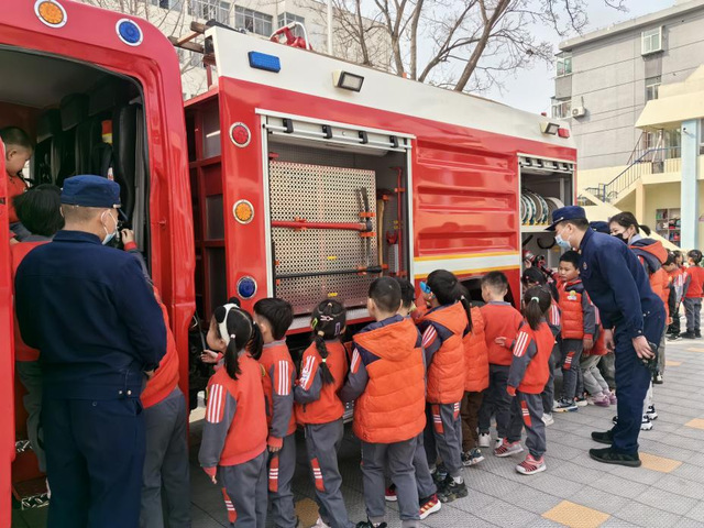 消防安全进校园:邀请泰山区消防救援大队救援人员走进幼儿园开展消防安全教育活动。