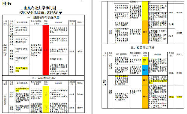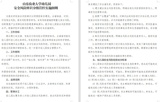 为进一步提升安全管理的科学性和精准性,山东农业大学幼儿园制定了《安全风险辨识分级管控细则》。该细则明确风险辨识的范围、方法和流程,将园内可能存在的安全风险划分为不同等级,并针对不同等级的风险制定了相应的管控措施。通过风险辨识分级管控,幼儿园能够更加清晰地掌握各类安全风险的分布情况,有针对性地采取预防和控制措施,有效降低安全事故发生的概率。